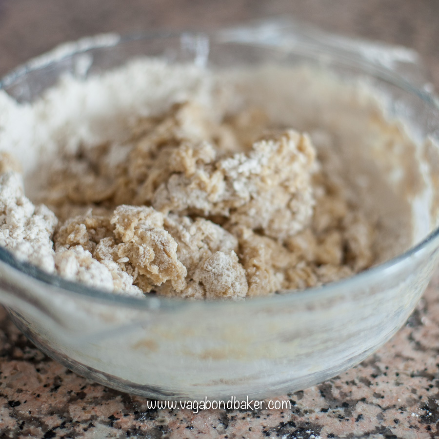 Add most of this liquid to the dry ingredients and begin to combine, switching to your hands. You may need all the liquid, you may need a spot more, depending on the flour and the humidity.
