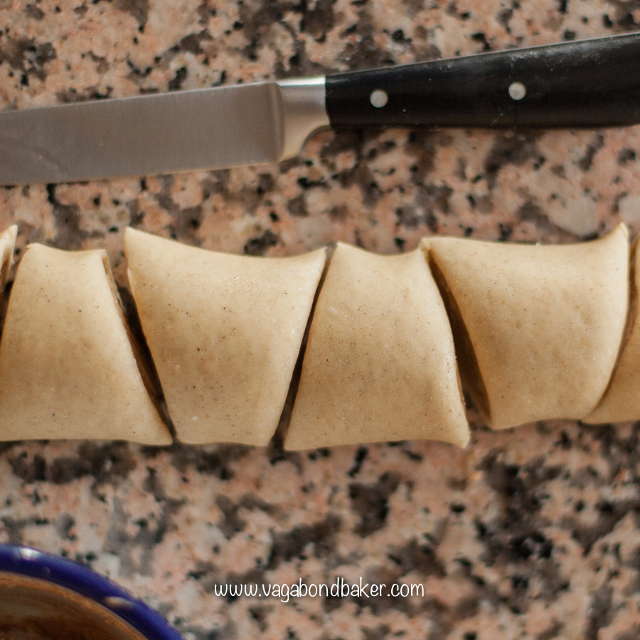 - Now cut the korvapuusti by slicing on an angle so each piece has a fat end and a thin end.