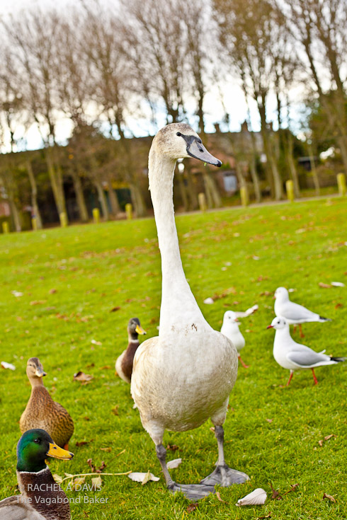 We were on baby-sitting duty today so we took little Martha down to the park to feed the ducks. This shy little swan, despite it’s size, hardly got any of the bread confetti but was happy to pose for a picture!