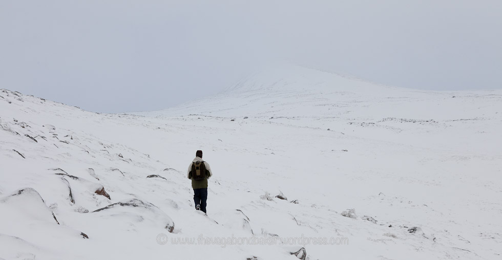 Our final full day was spent walking up from the Cairngorm Mountain car park along a trail to a corrie {Coire} in search of Ptarmigan in their winter plumage. The weather wasn’t great, I turned back after a while and left the guys to their photography. Instead I took the funicular railway up to the Ptarmigan restaurant near the top of Cairngorm Mountain. The restaurant boasts magnificent views which were lost in the white. Visibility was so low you could barely see the skiers and snowboarders on the pistes alongside it.
