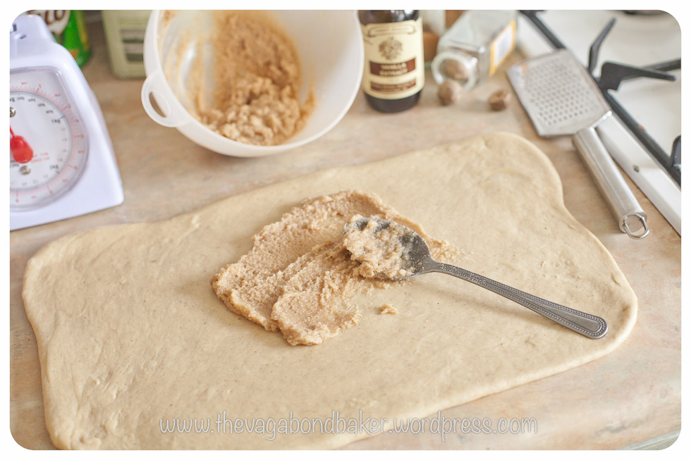 I’d seen a wonderful pull-apart loaf on a lovely blog ages ago and I’ve been meaning to make one. I simply used my hot cross bun recipe, altering it slightly in sweetness and spices, and omitting the fruit. Rather than shaping the dough into buns, I rolled it out flat, cut and stacked it to make layers which I then cut and popped into my muffin pan.