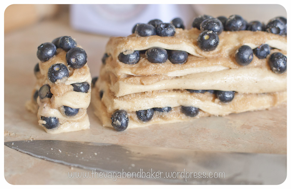 - Melt the butter in the microwave for 20 seconds, stir in the sugar, nutmeg, cinnamon and vanilla. Use a spoon to spread this mixture over the dough, right to the edges. Sprinkle the blueberries over the top and press them down slightly.