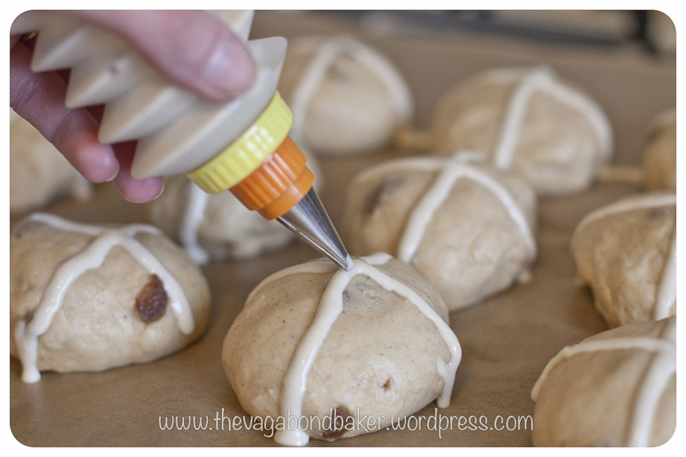 The easiest way to make these crosses is to put the flour paste into a piping bag or tube fitted with a small nozzle. A cone of parchment or a plastic freezer bag with the corner snipped will do the same job. Pipe crosses onto the risen buns.