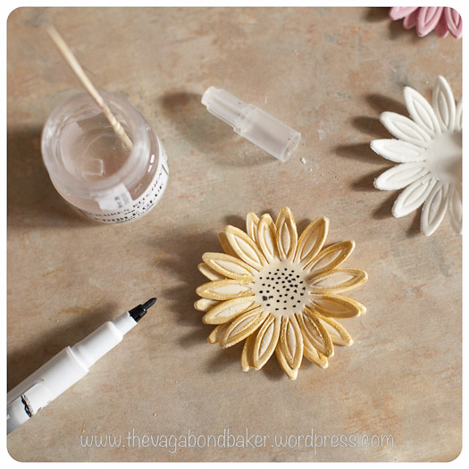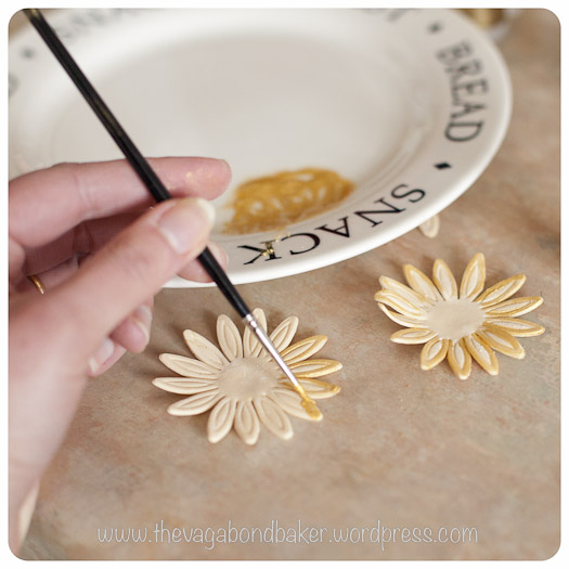 Once they are dry you can paint or dust lustre powder over them. I painted mine. Put a little heap of lustre powder onto a plate then add drops of rejuvenator spirit fluid, or vodka {I prefer the rejuvenator fluid as it comes in a handy dropper bottle}. Paint detail onto your flowers with a very fine paintbrush. I find the lustre paint needs regular ‘feeding’ with the rejuvenator spirit to keep it fluid, it’s very thirsty!