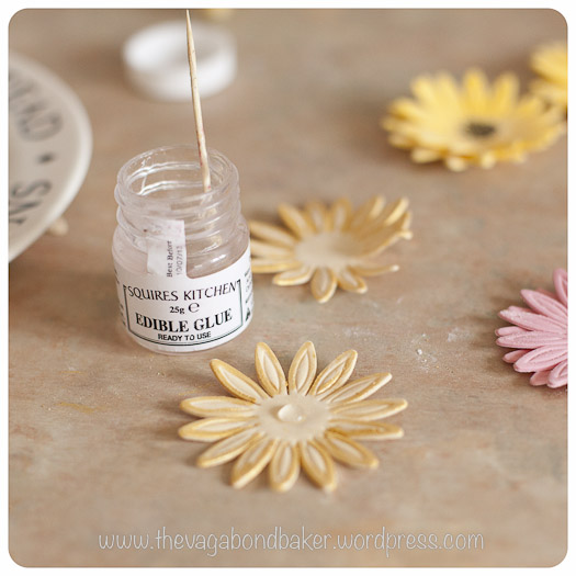 The gerbera flowers can be doubled up, glue one on top of the other with edible glue, or a spot of vodka or water. You can add detail with an edible felt pen or black icing.