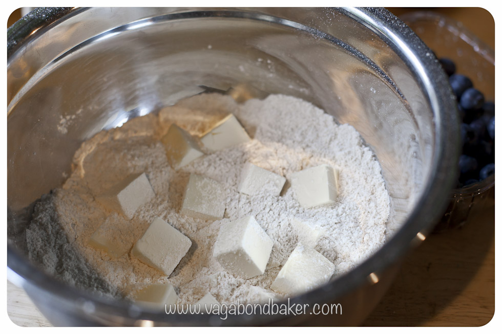 Cube the cold butter and add it to the bowl. Using fingertips, rub the butter into the flour and sugar until it becomes crumb-like.