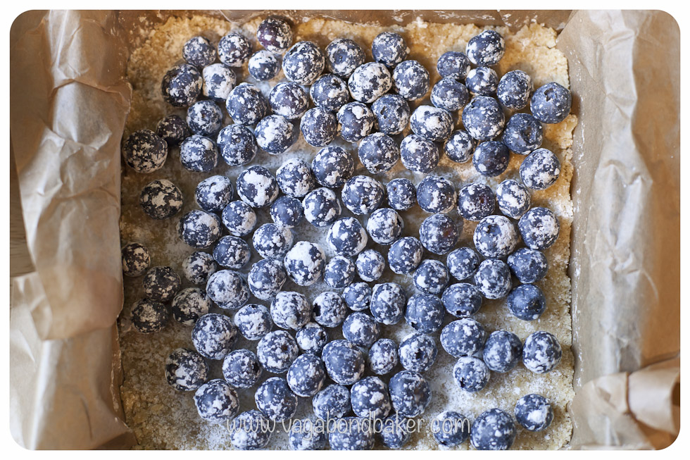 Lightly press a third of the mixture into the base of the lined tin. Add the blueberries and sprinkle over the cornflour. Shake the tin from side to side so the blueberries roll about and become coated in the cornflour.