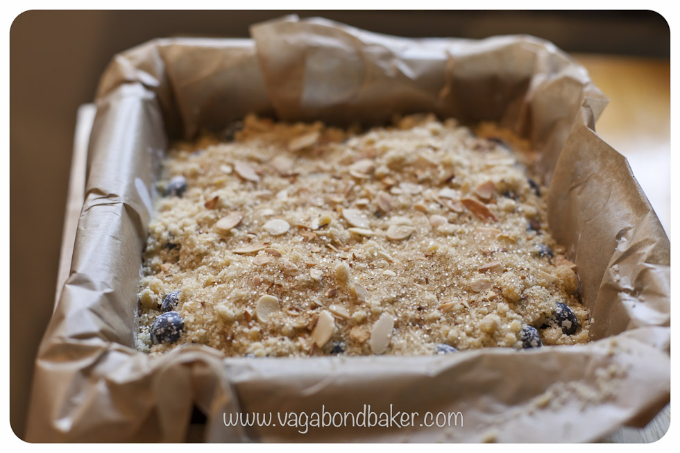 Take the rest of the crumble mixture and scatter it loosely over the blueberries. Toss over the slivered almonds if using then finish with a sprinkle of the demerara sugar.
