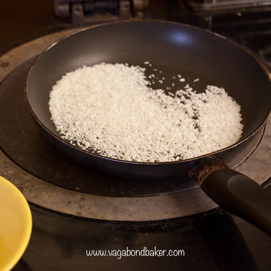 Firstly, toast the coconut in a dry, oil-free frying pan over a fairly high heat until it turns golden brown, shaking or stirring often. It will only take a minute or so. Transfer to a small dish and set aside.