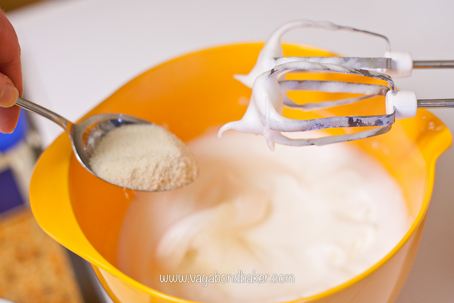 - Beat the eggs to stiff peaks then slowly add the sugar in spoonfuls