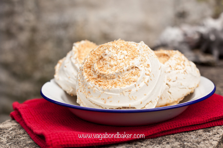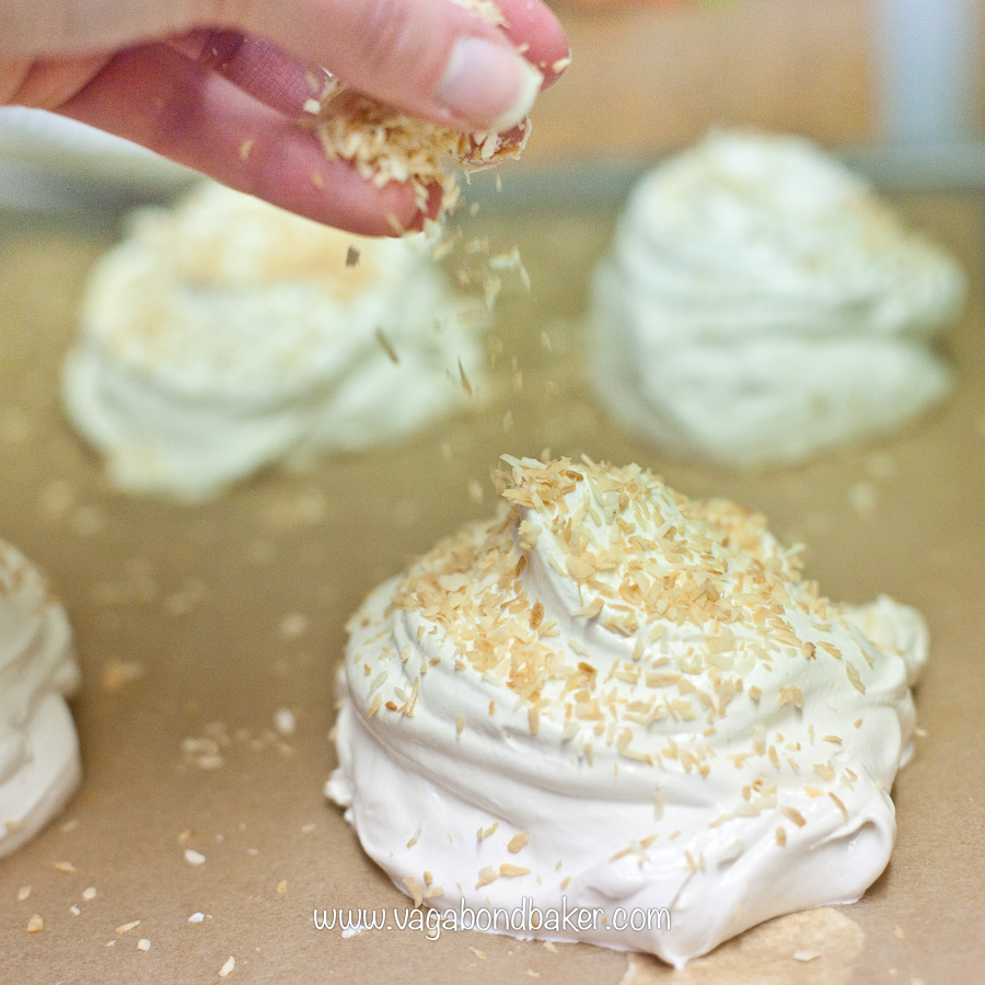 Spoon four large mounds of meringue onto the prepared baking sheet and use the spoon to create swirls on the top. Gently sprinkle the toasted coconut over the meringues then pop into the oven. Set your kitchen timer for 2 hours.