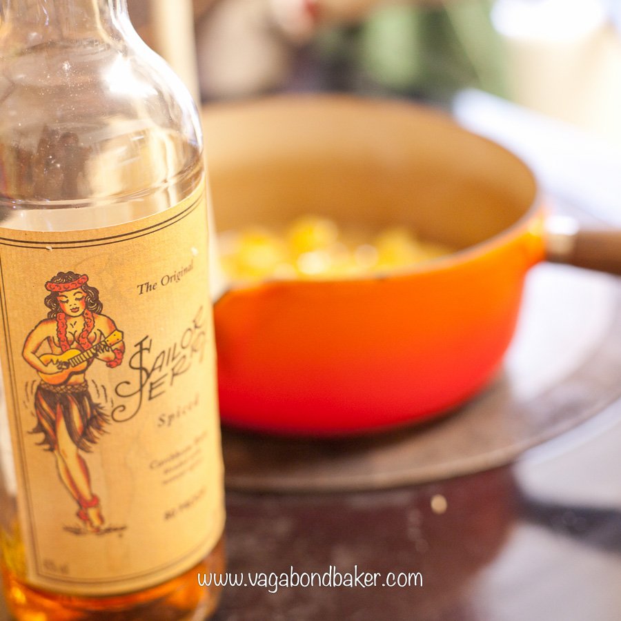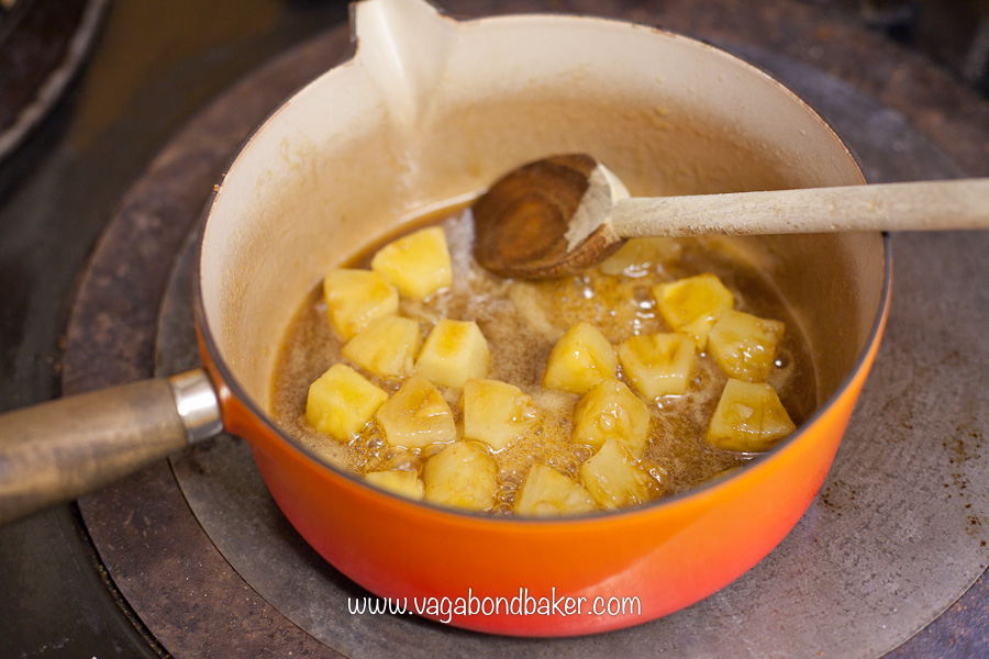 Put the butter and sugar into a frying pan and heat until bubbling, stir in the drained pineapple and lower the heat. Cook the pineapple in the buttery sauce for a few minutes until it softens a bit then stir in a splash or two of rum to taste.