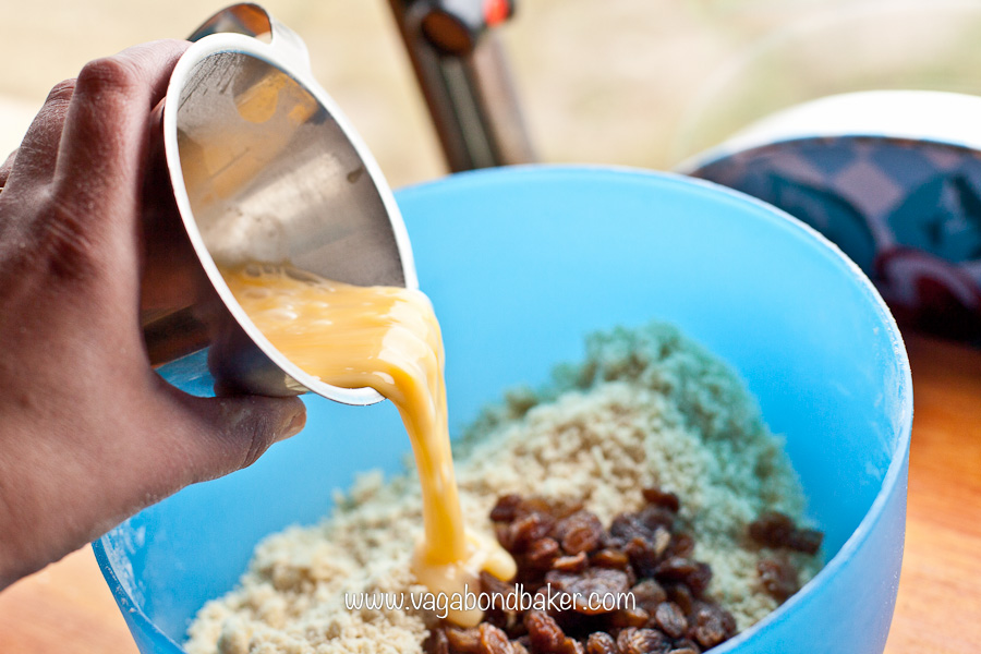 Stir in the sultanas/currants followed by the beaten egg, starting with a wooden spoon and finishing with your hands to bring the dough together. Add a bit more flour if the dough seems too wet.