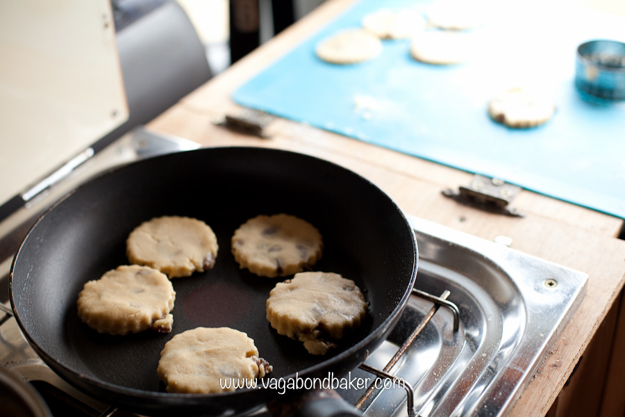 They are great to make while camping but you do need something to roll the dough out on, I use a silicone mat, it can be used anywhere and rolls up small to store or transport. I use it all the time for all sorts of things, nothing sticks to it when rolling out. As far as a rolling-pin is concerned, if you don’t have one with you a clean wine bottle {full or not} or similar does the trick! A cup used as a measure negates the need for scales, you could use a cup or plastic tumbler to cut out the cakes if you didn’t have a fluted cutter.