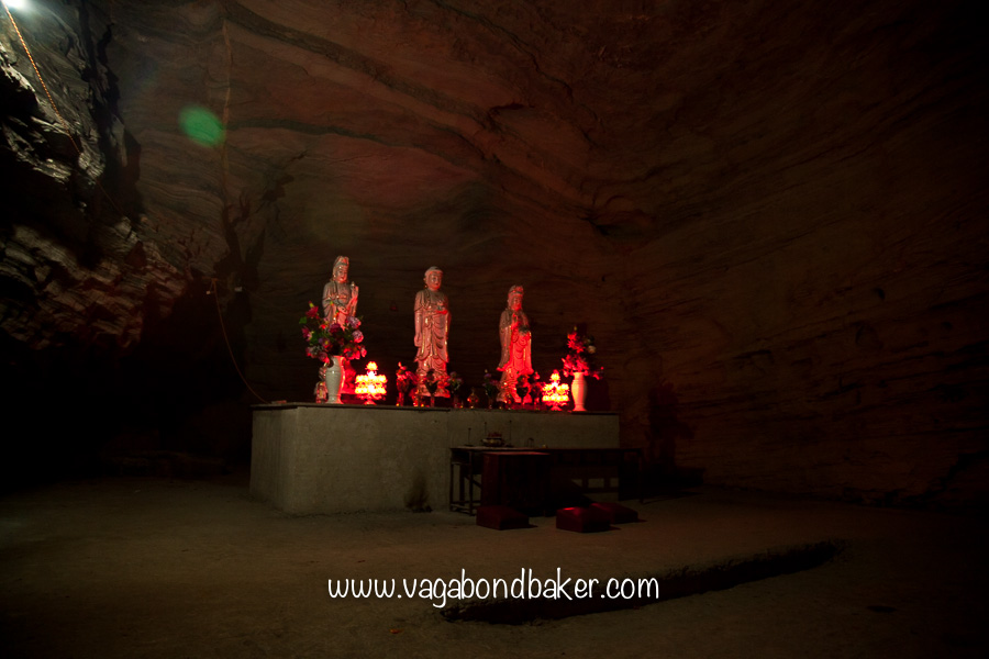 Tucked under rocky overhang the Tengjiao Nunnery is a Ming Dynasty temple on what would have been the river’s edge, but the river here was virtually dry. We were encouraged into the temple by an extremely enthusiastic man, all grins and extraordinary waving arms. He ushered us through the temple to the cave at the back. Behind the temple buildings there is a spacious cave, with an altar of figures, our excitable guide used his torch to illuminate details in the cave roof, it was quite an unexpected experience, we tipped him a few Yuan for his troubles.