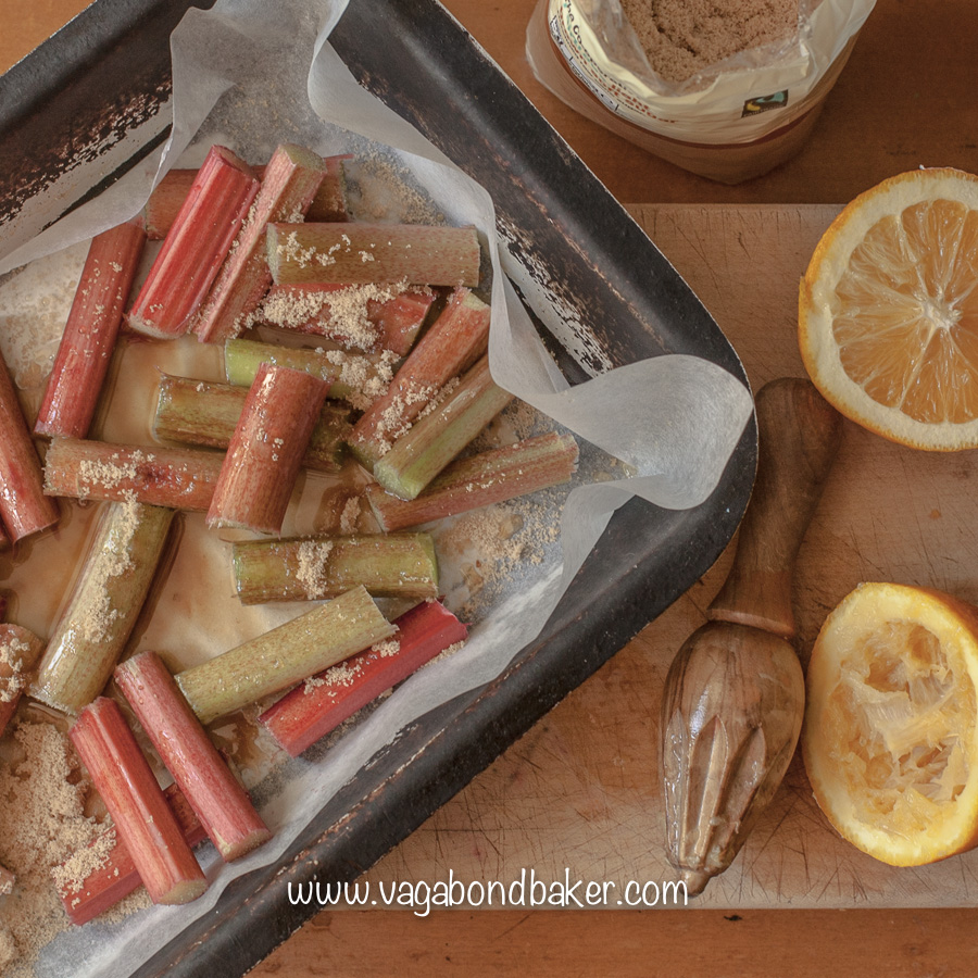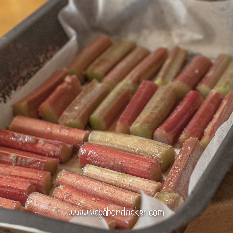 - Wash the rhubarb then cut it into 2 inch lengths then place it into the roasting tin {I lined mine but it’s not necessary}.