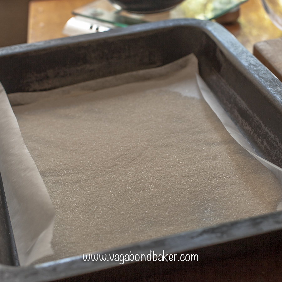 - Scatter the caster sugar over the lipped parchment in the roasting tin. Gently shake it out to cover the tin evenly. Place into the hot oven, or the floor of the roasting oven and cook for 5 mins. The sugar should be hot and use starting to melt at the edges.