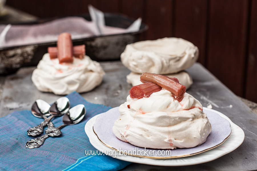 Clouds of meringue topped with velvety fresh cream and roasted rhubarb freshly harvested from the garden, these individual rhubarb pavlovas are luscious and summery.