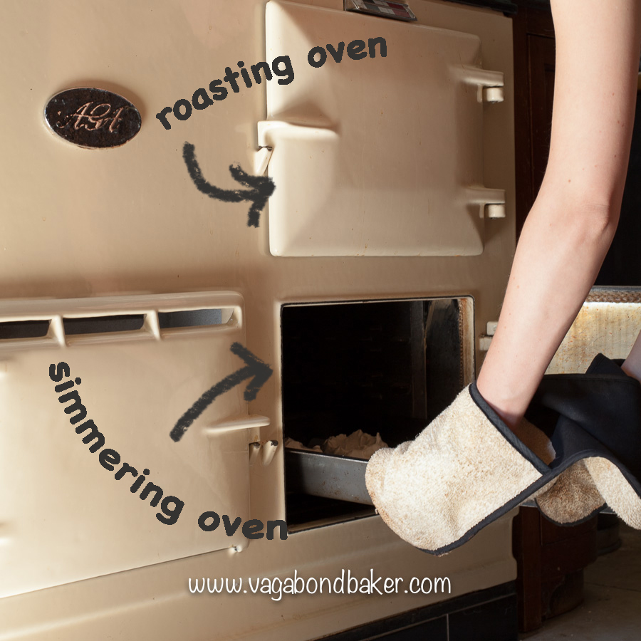 For those of you who have never come across an Aga, it is a large cast iron, heat storage cooker, a stove that is always hot. The basic Aga comes with two ovens, a hot roasting oven and a gentle simmering oven, on top there is a hot plate and a simmering plate, for boiling and frying. Larger Agas have up to four ovens, all at different temperatures.
