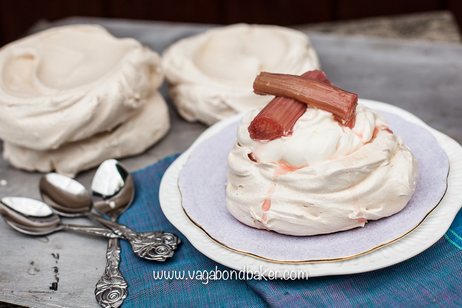 Clouds of meringue topped with velvety fresh cream and roasted rhubarb freshly harvested from the garden, these individual rhubarb pavlovas are luscious and summery.