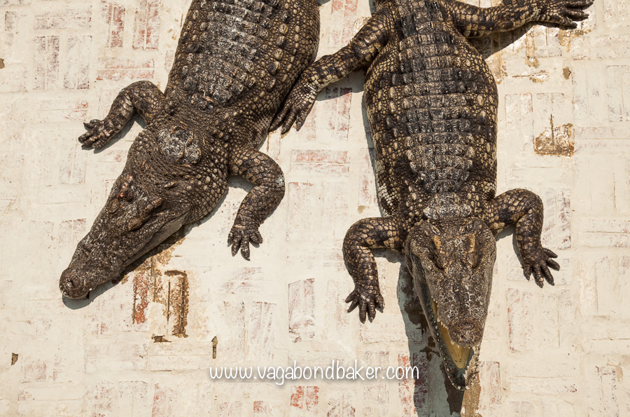 The crocodiles were basking in the sun, contained in concrete enclosures, and there were hundreds of them. A raised walkway kept us out of snapping range, the crocodiles eyeballing us as we moved along.