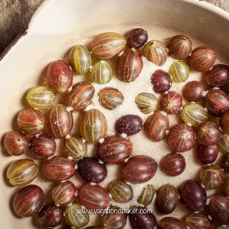 - Top and tail the gooseberries with scissors then toss them into an oven-proof dish along with the 50g of caster sugar. Bake for around 20 minutes or until the gooseberries are plump and soft.