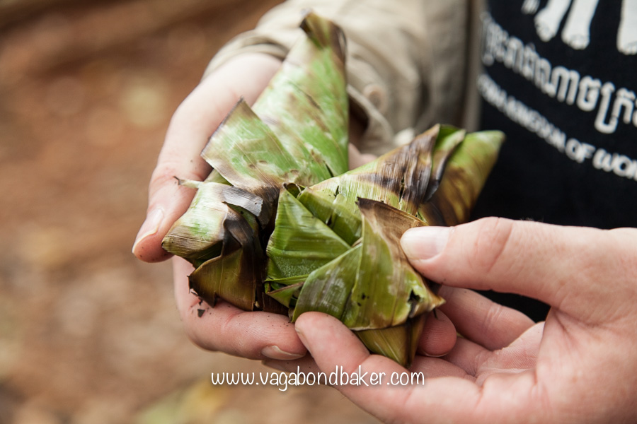 Mr Nine produced a snack, we’d been on the go since 8am so these banana leaf parcels of smokey sticky rice were perfect. We perched on the roots of a vast banyan tree to rest for a moment.