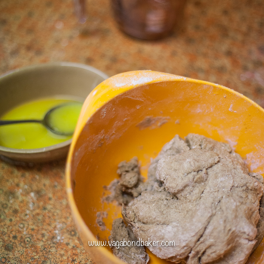 - Now add a tablespoon of melted butter, or oil, mixing it in. Knead the dough for about 5 minutes or so until the dough relaxes into a dense, fairly smooth ball. Add a little more white flour or water if necessary. You could certainly do this in a mixer with a dough hook.