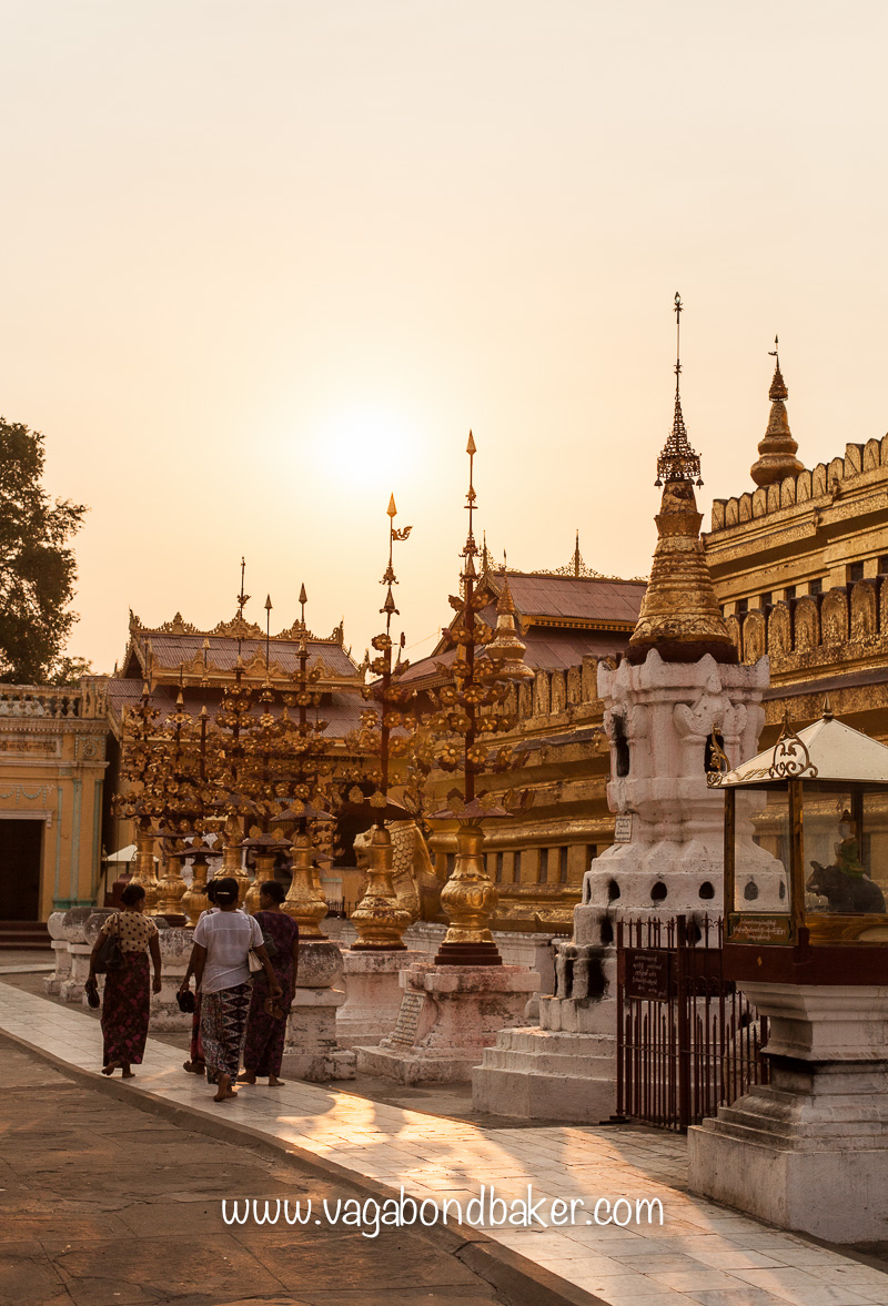 Surrounding the zedi were a number of art deco style shrines, painted in pretty pastel colours; a few locals were padding clockwise around the warm marble footpath while two men were posing for photographs in front of the zedi.