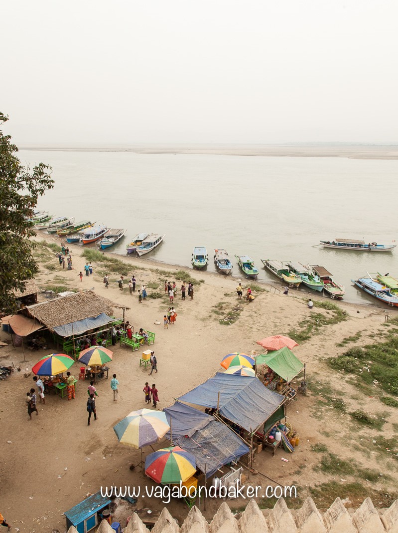 We decided to continue along the road, it brought us out at Bupaya, an early temple with a small golden stupa, although what you see today is a reconstruction as the temple was destroyed in a huge earthquake in 1975. The temple sits high up on the bank of the Ayeyarwaddy river with terraces leading down to the water.