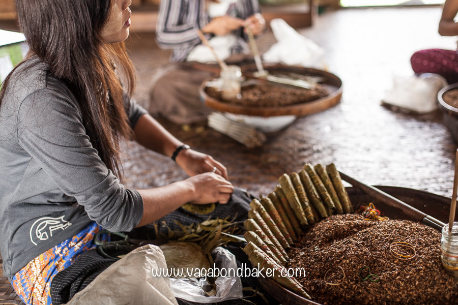 Our destination here was a cheroot factory where we were ushered in to see three young women hand rolling small cigars and cigarettes. Each of the girls were sat cross-legged on the floor with a wide dish, piled with fragrant tobacco, between their knees.