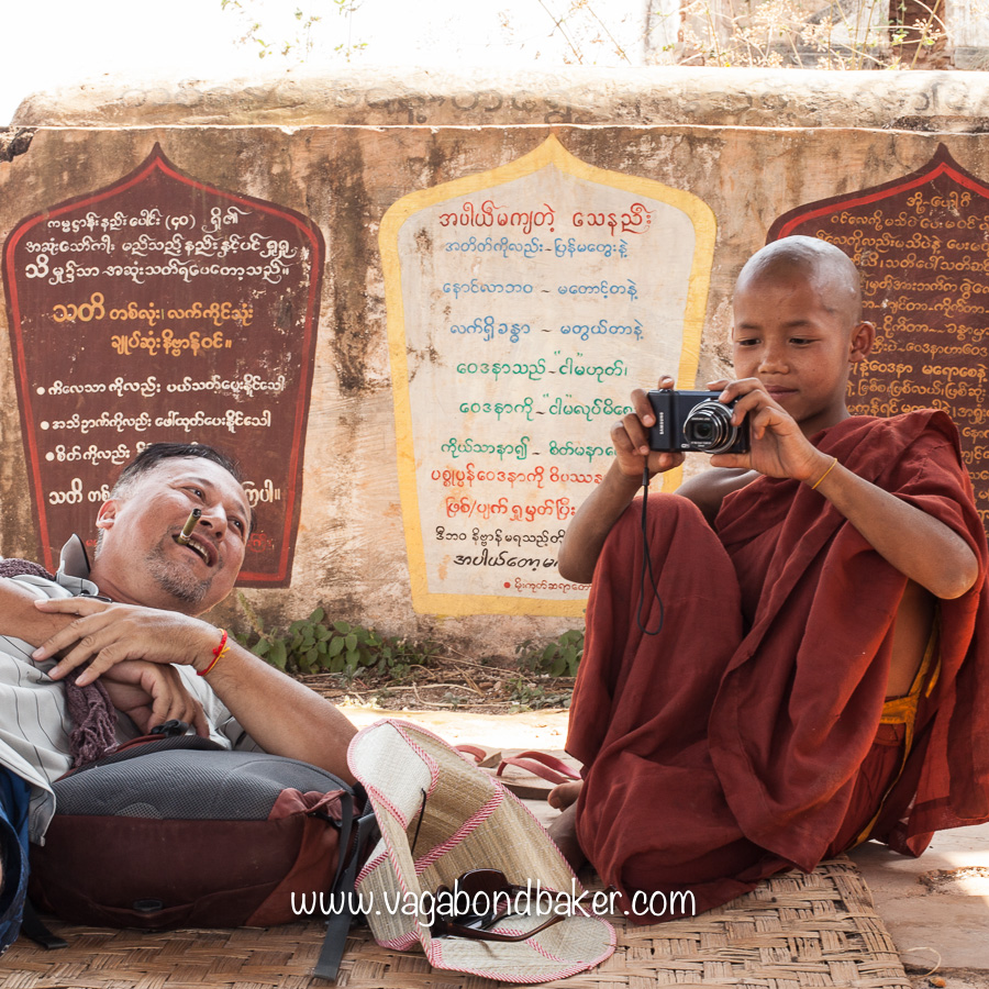 He spoke no English, gesturing that we should give money to the Buddha statue nearby. When we made to leave he asked for money, something monks are apparently forbidden from doing; we don’t know whether he was a fake monk or simply a kid monk taking a chance. I personally go with the former; but hey, he looked cute in the photos, and he totally took the money we left for Buddha!