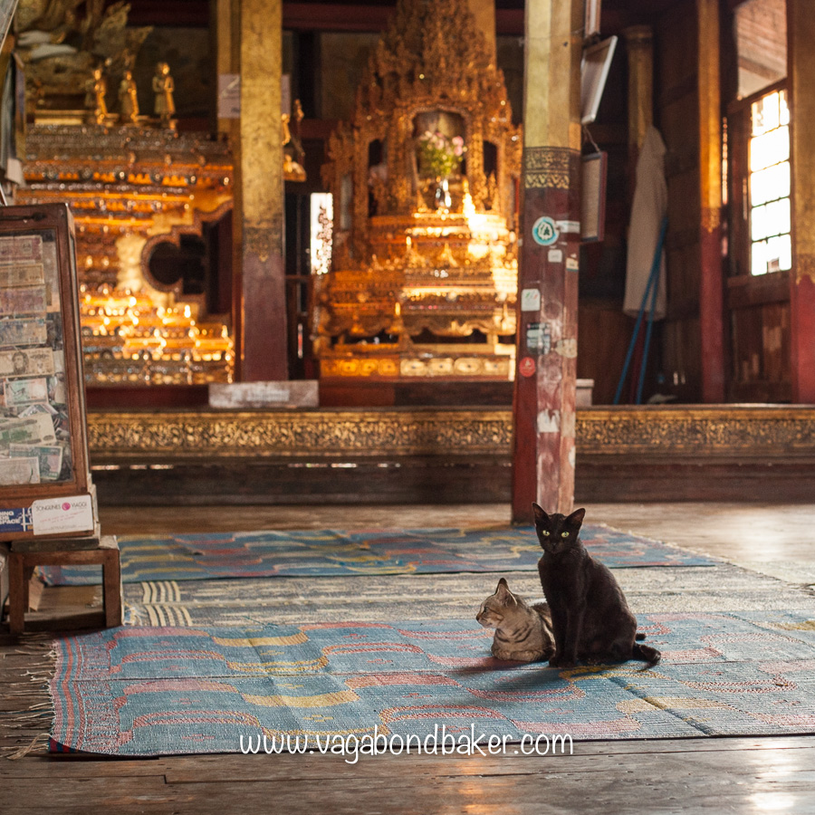 We boated to our final destination of the day, the Nga Hpe Kyaung: the Jumping Cat Monastery. In the past, the monks taught the temple cats to jump through hoops during their free time; this, in turn, became a tourist draw. The temple was lovely, dark and cool; the cats were evident as soon as we stepped inside.