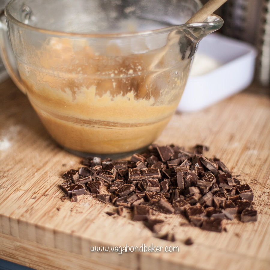 Sift the flour and salt into the bowl and stir to combine. Add the chocolate chunks and give it all a good mix to distribute. If it looks a bit dry and isn’t holding together, add a tablespoon more of milk.