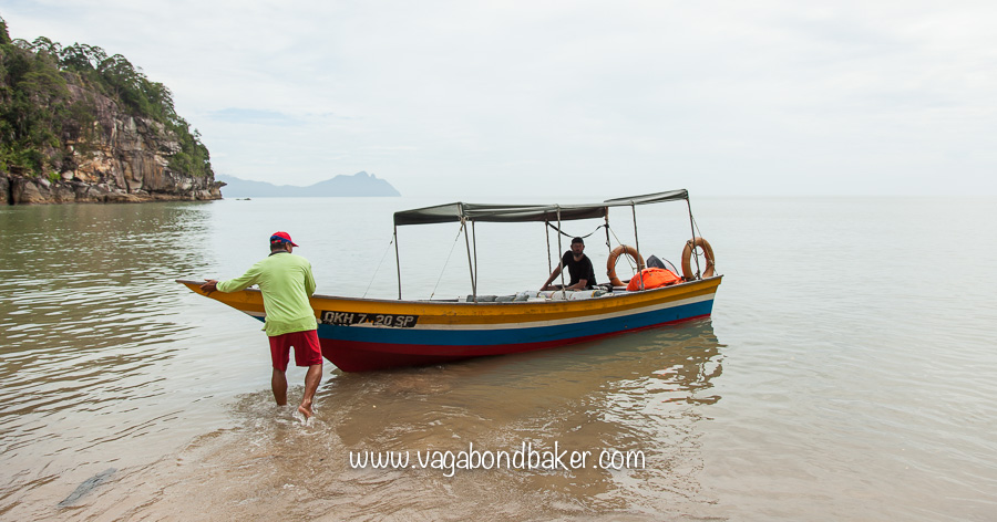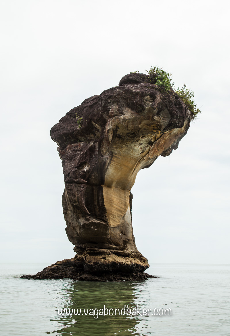 We reached the end of the trail at Telok Pandan Kecil and took a boat to Telok Sibur, a bigger beach a little way around the coast, passing curious sea stacks. The boatman pointed all the rock formations out to us.