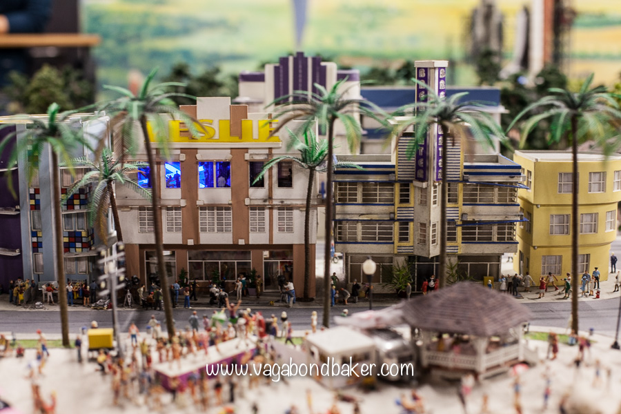 In the dark lights come on inside buildings, on trains, the fairground lights up. In the America section, Las Vegas looks amazing with its colourful illuminations and the art deco buildings in Miami come to life in bright neon.