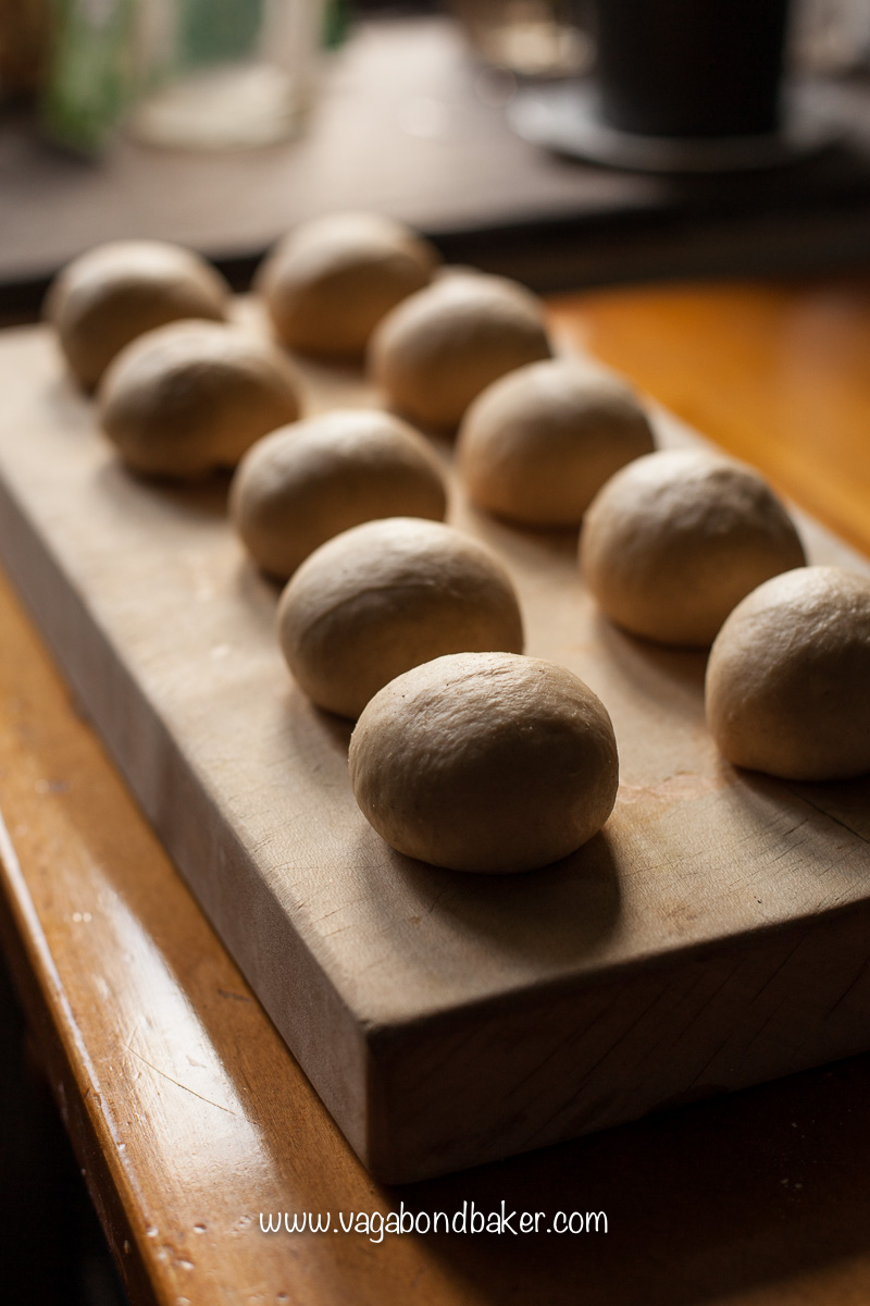 - Once it has proven, punch the air out of it in the bowl then turn it out onto the work surface. Now divide the dough into 10 equally sized pieces and roll each into a ball: I do this by placing the piece onto the work surface and forming a ‘claw’ over it with my hand, rolling into over the work surface, it forms a perfect ball.