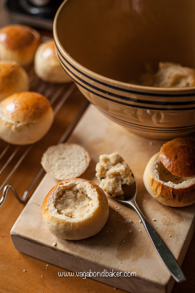 - Once cool, carefully slice of the top of each bun then using a teaspoon (a serrated grapefruit spoon – remember them? – would be even better) scoop out some of the insides of the buns to create a hollow, and place the removed crumbs into a mixing bowl: do not discard.