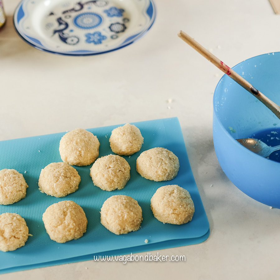 A simple recipe of coconut and ground almonds combined with coconut oil and a sweetening syrup to make moist little cookies.