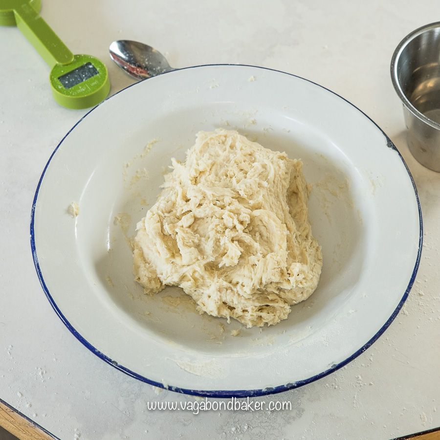 - Pour in around 100 mls of the warm water and begin to bring everything together with your hands, adding more of the water if you need to, to get to a soft dough that’s slightly sticky. Use a bit more flour if it’s too sticky.