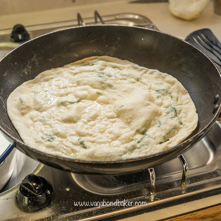 - Heat your frying pan over a medium to high heat. Place the flatbread oil-side down into the pan and fry for a minute or two until air bubbles begin appear on the surface and it takes on a golden colour on the underside.