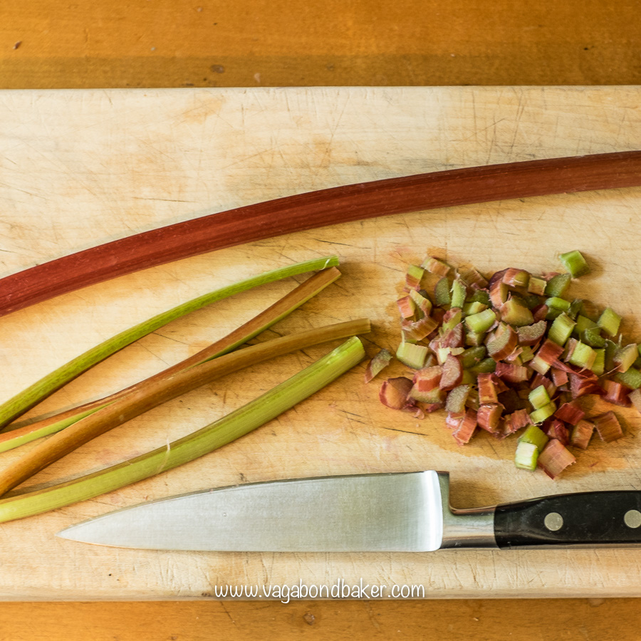 - With the rhubarb finely chopped, stir together with the 2 tablespoons of caster sugar and set aside.