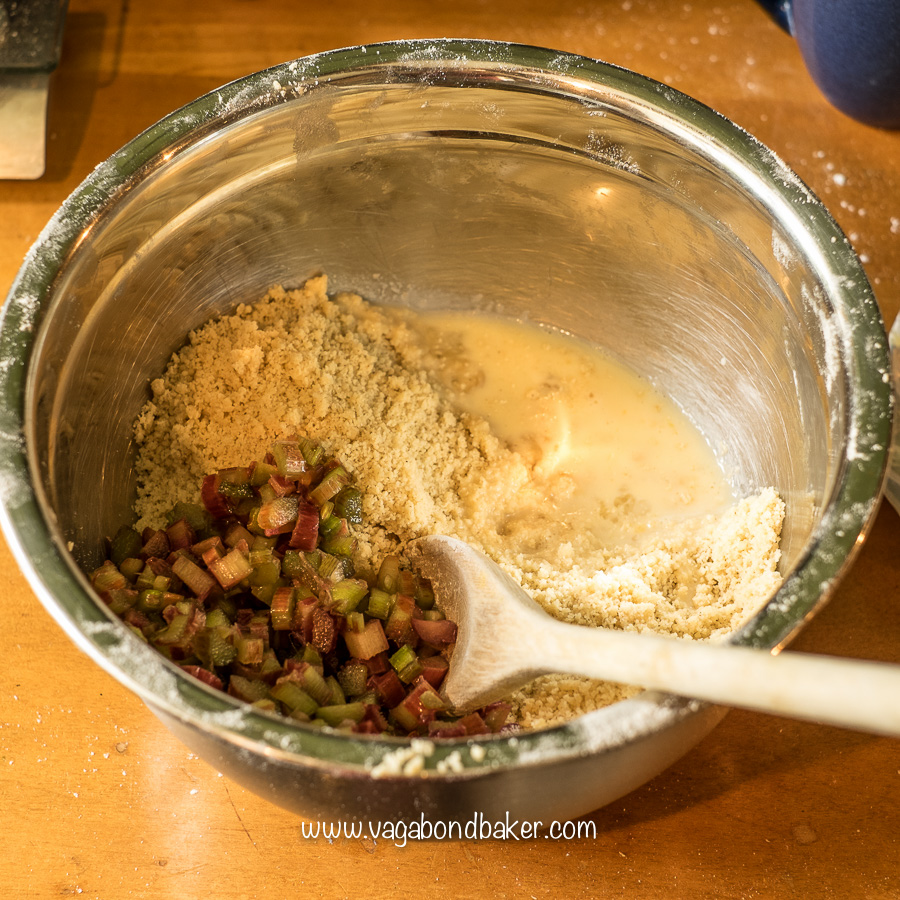 - Rub the butter into the flour, baking powder, sugar and spices. Add the rhubarb along with the egg and the milk.
