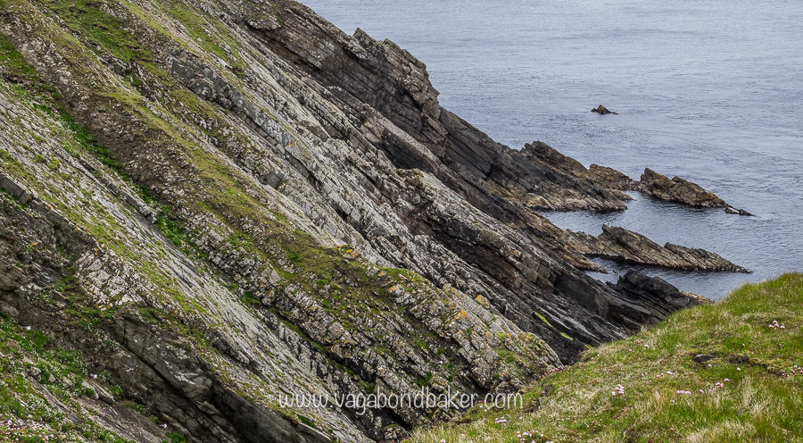 The grassy edge was clipped short by wooly sheep and tiny blue flowers mingled with the pink thrift, every now and again the land would suddenly fall away, a deep gorge cutting into the island down to the frothing sea below.
