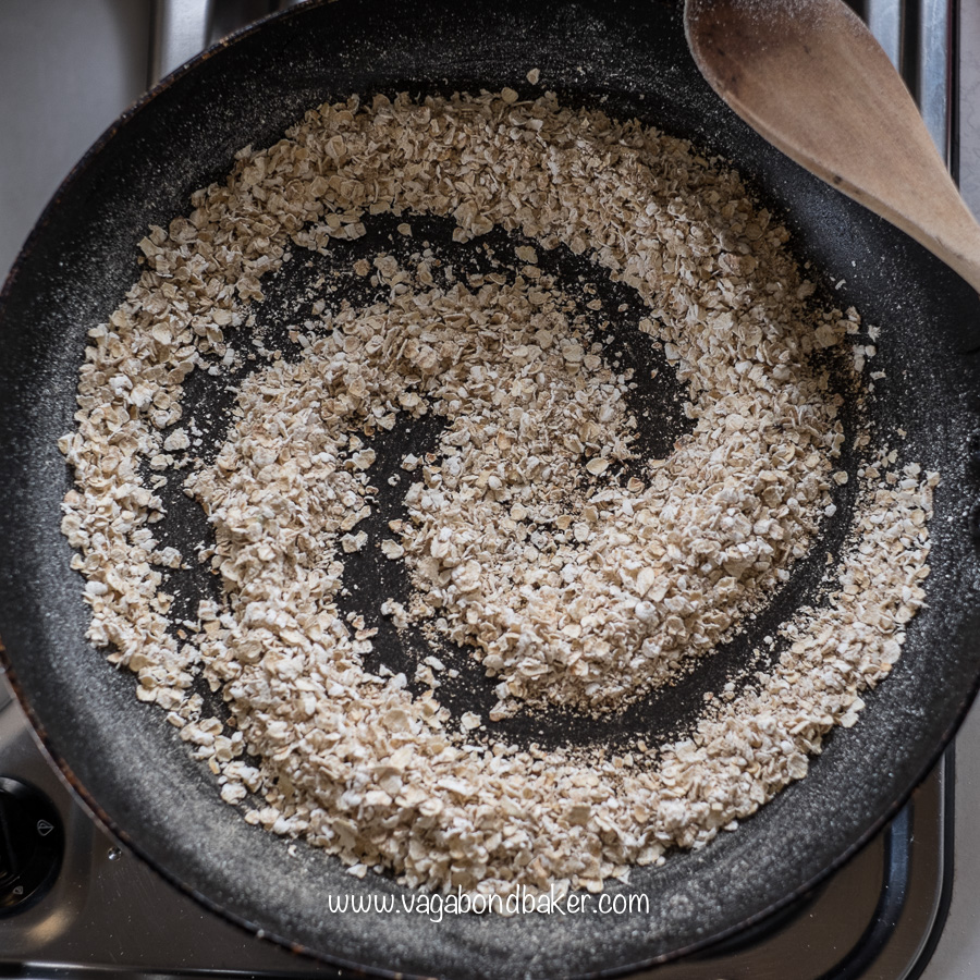 - Place the rolled oats into a dry frying pan and toast over a medium to high heat until lightly coloured. Keep them moving all the time so they don’t burn.