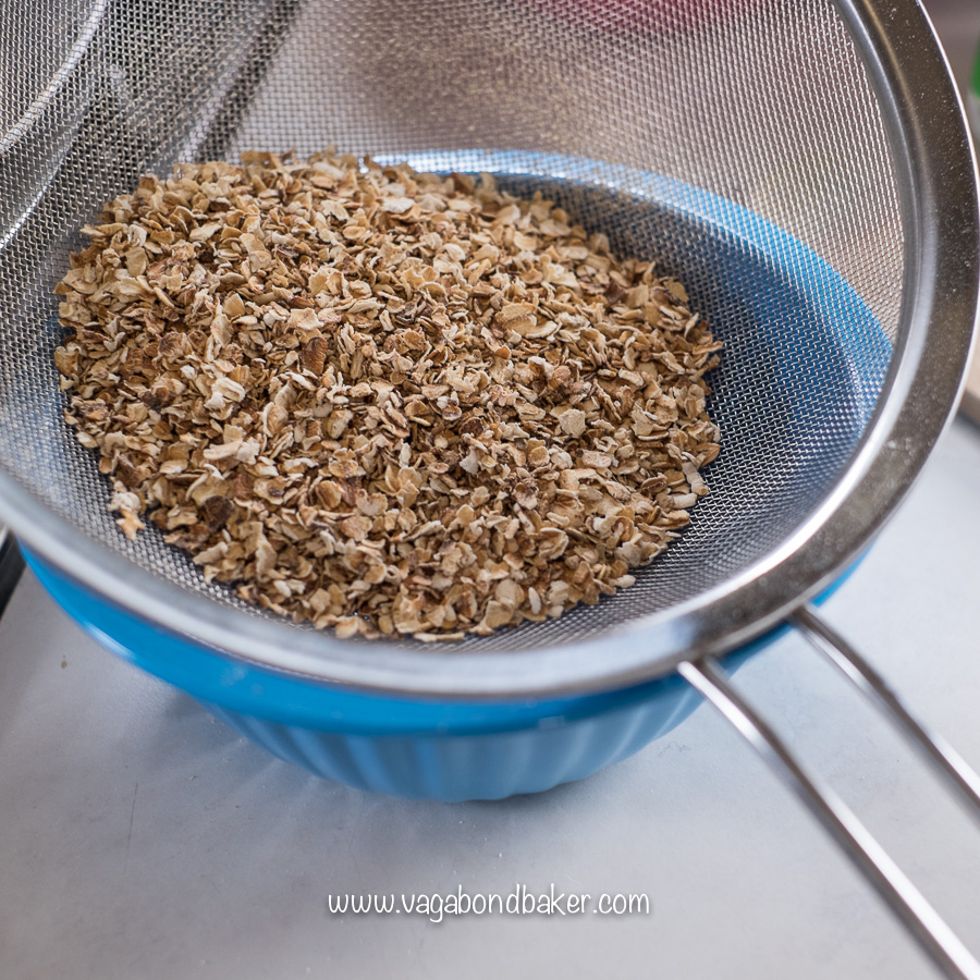 - Remove from the heat and sieve to remove any loose darkened dust. Set the sieved oats to the side so cool off while you whip the cream.