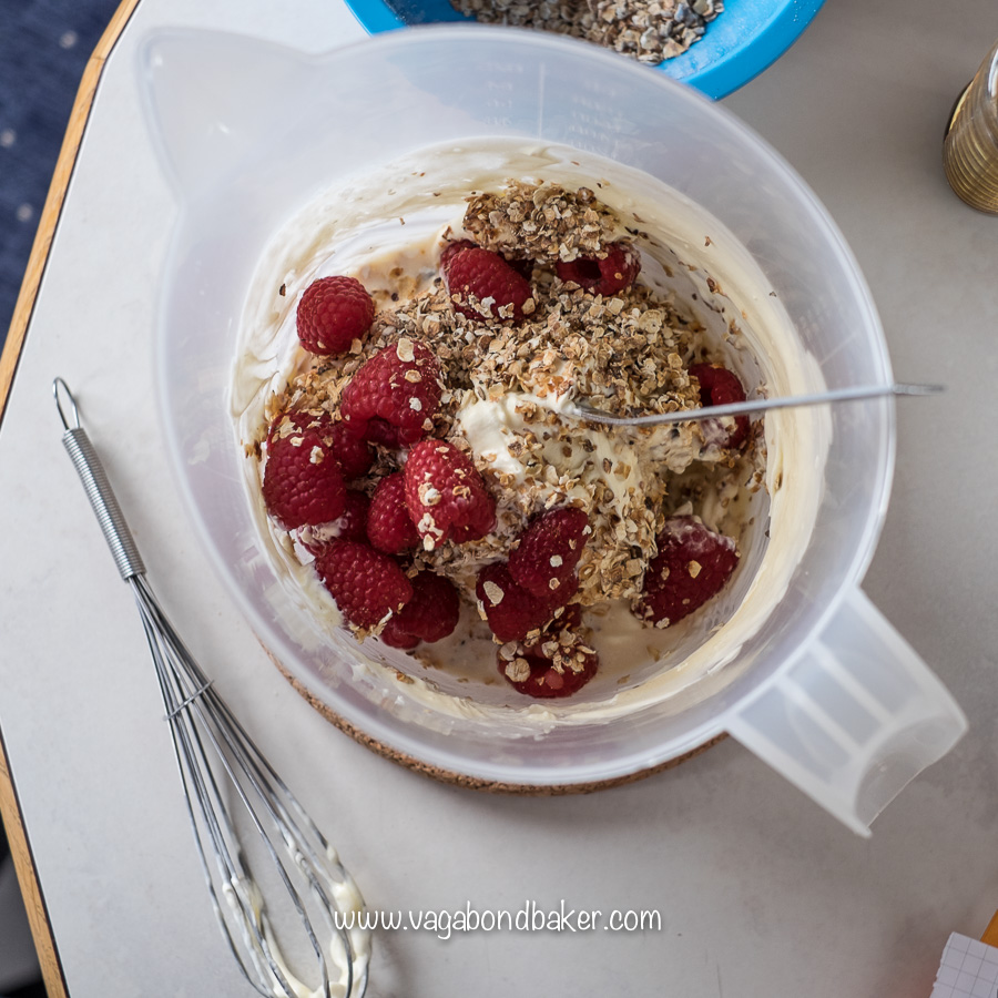 - Whip the cream to soft peaks then stir in the whiskey, the honey, most of the raspberries and the oats, reserving a little to sprinkle over the finished desserts.