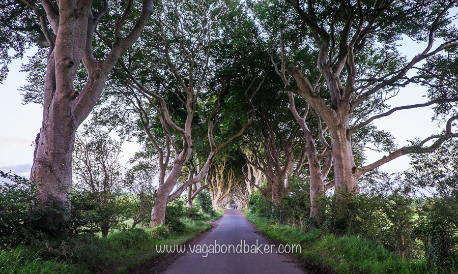 As the sun was teetering on the horizon we saw a sign for the Dark Hedges, it was only a short detour so in the last light of the day we found ourselves wandering down the vaulted avenue of intertwined Beech trees straddling Bregagh Road.