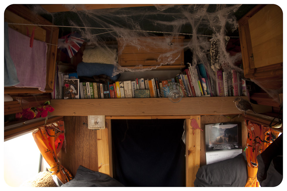 The clouds rolled in overnight however and we woke up to rain and white clouds. Donning waterproofs, we had a short walk around some small lochans after the Hokey Pokey was set and safely stored. But the rain continued so the rest of the day was mostly spent cosied up in the van, which is all decked out for Halloween. I’ve stretched ‘spider webs’ across the roof {which are driving Chris mad, as he is a bit taller than me and the webs keep attaching to his woolly hat!} and strung up some lights across one of the windows. It gets us in the mood! Not sure if we’ll get any Trick or Treaters but I’ll be prepared with some home-made Hokey Pokey!