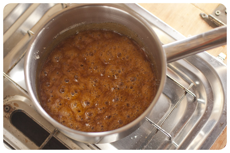 Put the sugar and golden syrup in a large saucepan {do not use a non-stick one however as this effects how the sugar crystallizes}. Give it a good stir to combine then remove your spoon. Place over a medium to low flame and gently melt the two together, bring it carefully to the boil, it will bubble rapidly for a bit then calm down as the caramel darkens. Keep your eye firmly on it.